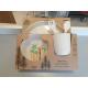 Set repas de la marque REER comprenant un verre, un bol, une assiette et une fourchette et une cuillère.