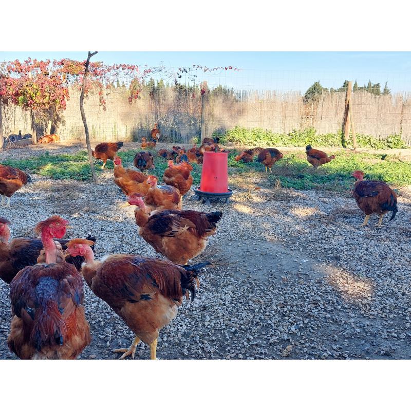 Chapons élevés en plein air, avec une nourriture 100% naturelle et sans OGM, sans antibiotique.