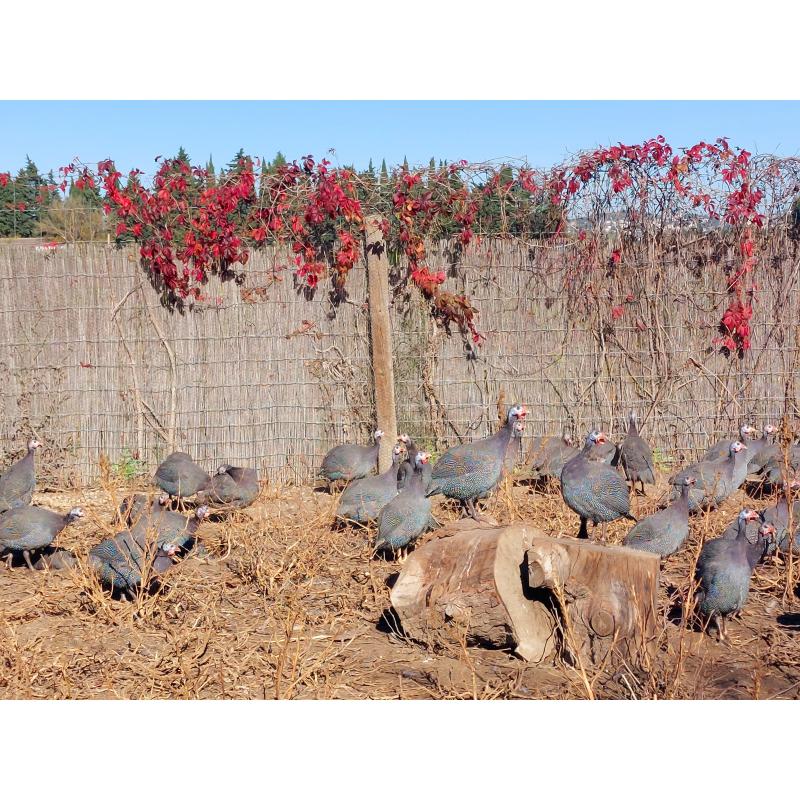 Pintades élevées durant plus de 150 jours en plein air, avec une nourriture 100% naturelle et sans OGM, sans antibiotique, nourries au mais et petit lait pour une chair plus tendre et savoureuse pour votre repes de Fête.